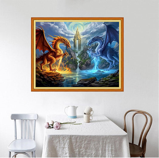 Foxhool Beginners Cross Stitch Kits Stamped Full Range of Embroidery Kits for Adults DIY Cross Stitches kit Embroidery Patterns for Needlepoint kit-Water Fire Dragon 16x20 inch