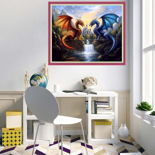 Disnesart Cross Stitch Stamped Full Embroidery Kits DIY 11CT Cotton Thread Printed DIY Needlepoint Kits Craft Needlework Set Cross-Stitch Stamped Sets-Water Fire Dragon Landscape 16x20 inch