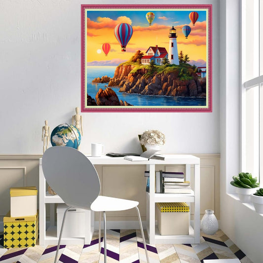 Disnesart Cross Stitch Stamped Full Embroidery Kits DIY 11CT Cotton Thread Printed DIY Needlepoint Kits Craft Needlework Set Cross-Stitch Stamped Sets-Seaside Lighthouse hot air Balloon 16x20 inch