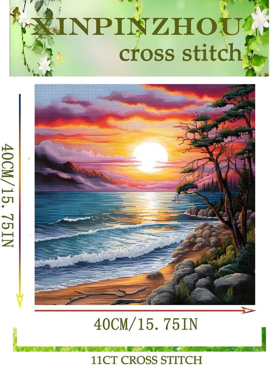 Xinpinzhou Seaside Landscape 11ct Cross Stitch Kits, 11 CT Funny Pre Printed Counted Stamped Cross Stitch Embroidery Needlepoint Patterns Kits for Beginners Adults Crossstitch 40x40 cm
