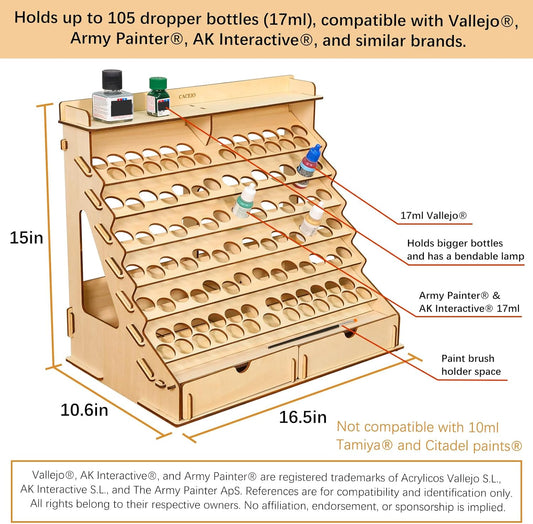 Paint Organizer with Brush Holder – 105-Bottle Holder with 6 Miniature Stands – Brush and Paint Storage for Miniature Painting