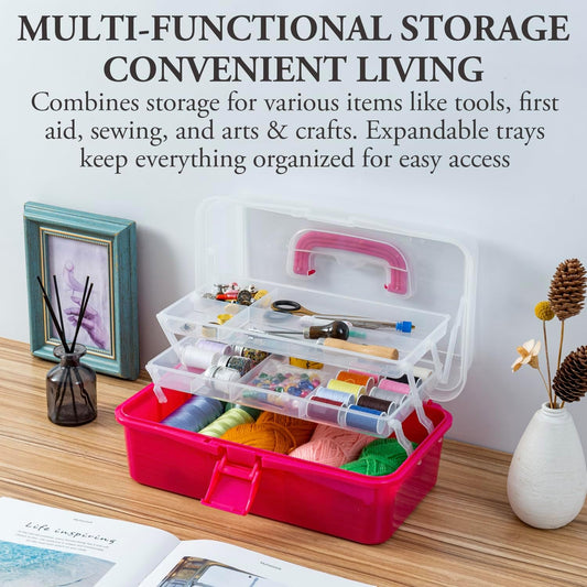 MyGift 13-Inch Dark Pink Plastic Craft Organizer and Storage Box – Clear Carrying Case with Latching Lid & 2 Expandable Trays for Sewing, Tools, First Aid, and Art Supplies
