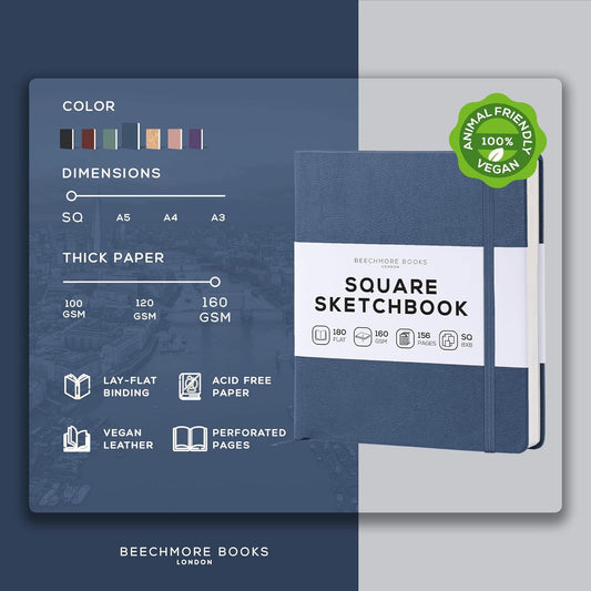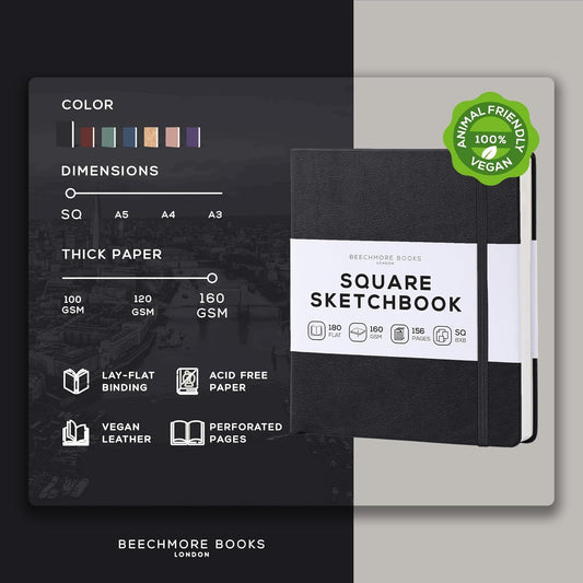 Beechmore Books Square Sketchbook – 8x8 Premium Vegan Leather Bound Large Sketch Book Hardcover with 156 Thick 160gsm Perforated Ivory Pages, Blank Sketch Pad, Gift Boxed Back Pocket, Ribbon Bookmark