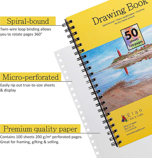 Elan A4 Drawing Book, 50 Sheets Italian Paper 90 lb/200 GSM, Acid-Free Sketch Book 11.7x8.3 Inch, White Drawing Paper Pad, A4 Sketchbook Spiral Bound