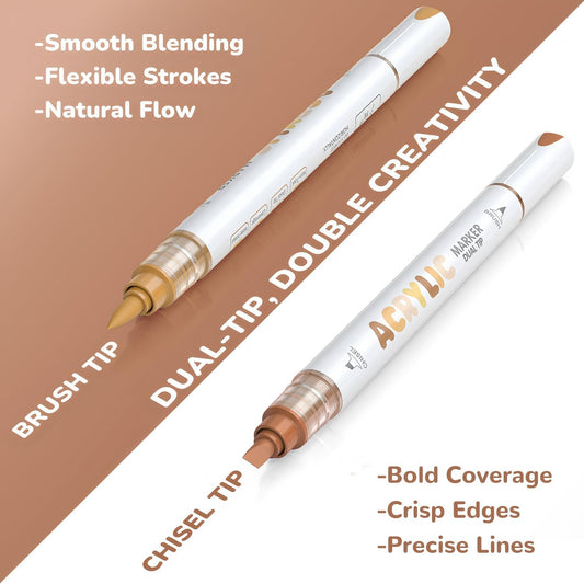 Guangna 12 Skin Tone Dual Tip Acrylic Paint Markers, Brush Tip & Chisel Tip Acrylic Paint Pens for Rock, Wood, Glass, Paper, Coloring Book, Ceramic, Canvas, Water-Based Ink