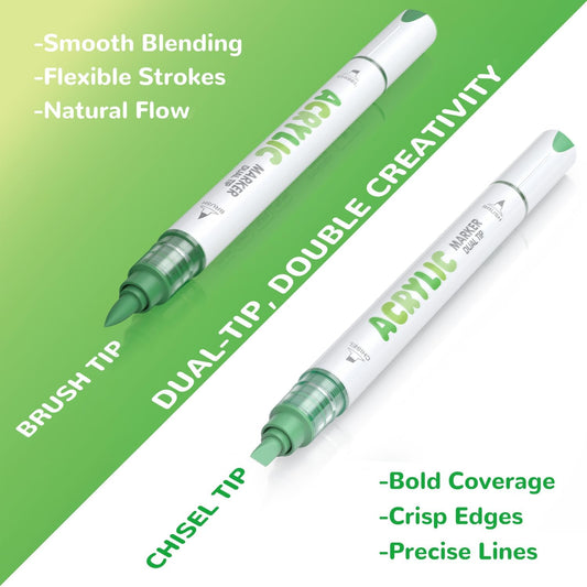 Guangna 12 Green Dual Tip Acrylic Paint Markers, Brush Tip & Chisel Tip Acrylic Paint Pens for Rock, Wood, Glass, Paper, Coloring Book, Ceramic, Canvas, Water-Based Ink