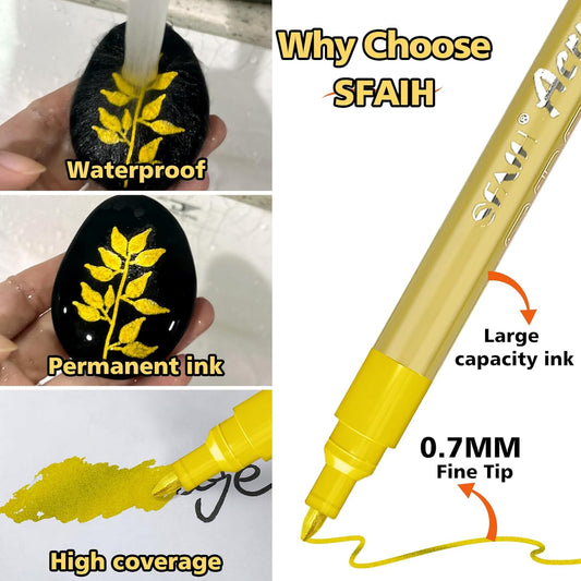 SFAIH Acrylic Gold Paint Pens - 8 Pack 2-3MM Medium Tip & 0.7MM Extra Fine Gold Markers Permanent for Rock, Wood, Metal, Fabric, Plastic, Glass, Ceramic, Diy Crafts, Large Ink Capacity, High Coverage