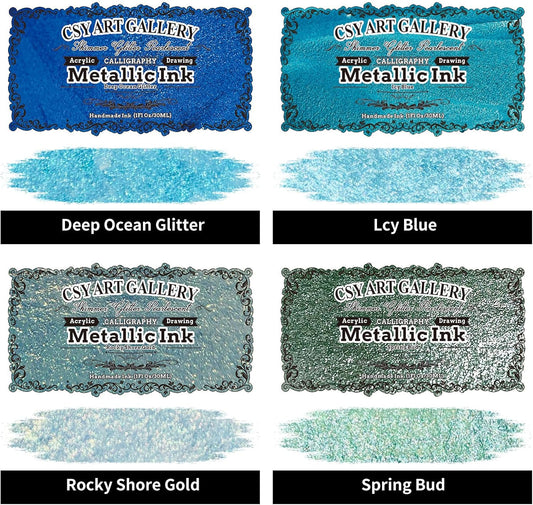 CSY art gallery Metallic Acrylic Ink-Craft Paint-Calligraphy Inks,Glitter-Pearlescent -ICY Blue Drawing Ink Liquid Gold Leaf Paints with Dropper, 1oz - 29.5 ml (Ice Lake Mountains Set)