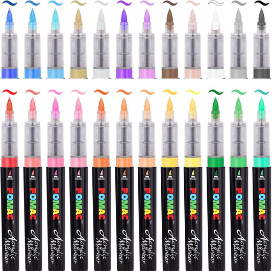 POMAC Liquid Acrylic Paint Markers 24 Colors, Waterproof Paint Marker Pens Brush Tip No-Bleed for Fabric, Canvas, Rock, Glass, Wood, DIY Crafts, Art Supplies