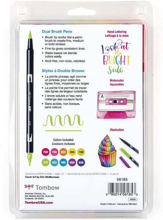 Tombow 56185 Dual Brush Pen Art Markers, Bright, 10-Pack. Blendable, Brush and Fine Tip Markers