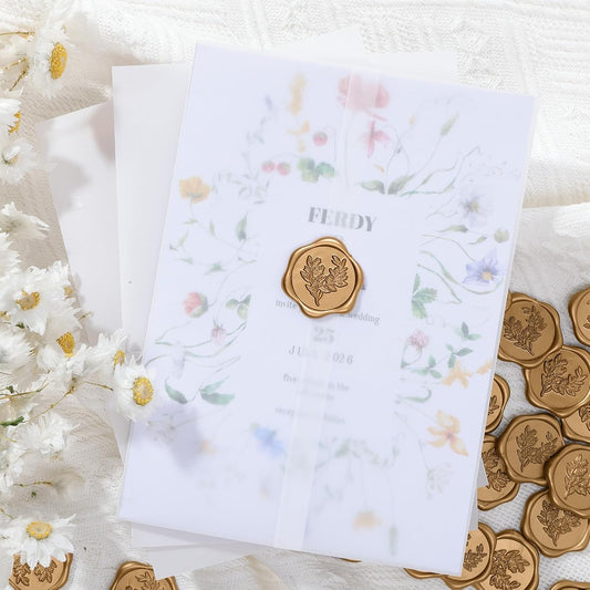 UNIQOOO 50 Sets Pre-Folded Vellum Jackets for 5x7 Invitation & Gold Eucalyptus Wax Seal Stickers, Wedding Invitations Wraps Bulk for Wedding Bridal Baby Shower Envelopes