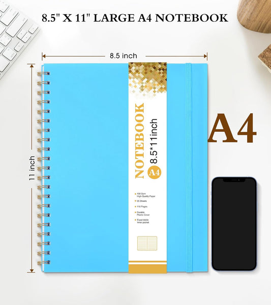 Spiral Notebook Journal 8.5” x 11”, Lined Notebooks for Women Men, A4 Large College Ruled Journal, 100 GSM Paper, Plastic Hardcover Spiral Bound Journals for Work School Business, Blue