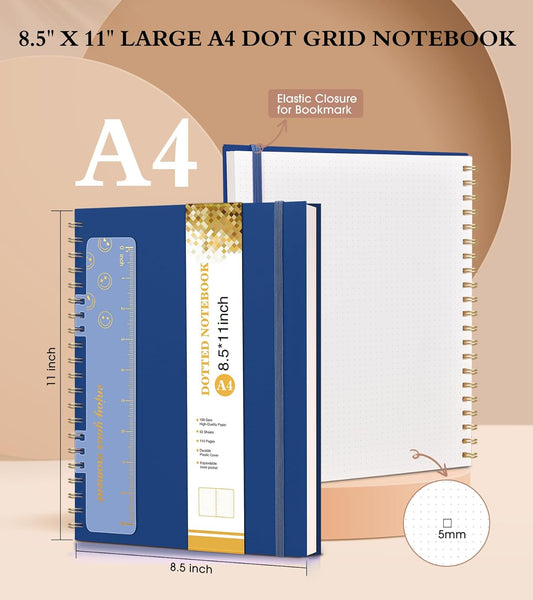 Dotted Notebook, Spiral Notebook Journal 8.5” x 11”, A4 Large Dot Grid Notebooks for Women Men, 100 GSM Dotted Paper, Plastic Hardcover Spiral Bullet Journals for Work School Sketching, Navy