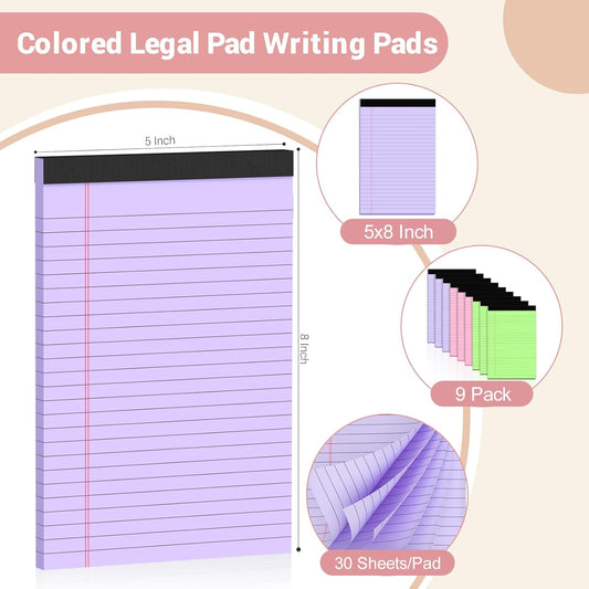 Legal Pads 5x8 Small Note Pads Colored Notepad, 9 Pack, Narrow Ruled Lined Paper, Micro Perforated Writing Pads Memo Pad, 30 Sheet/Note Pads, Notebook Paper Tablet for School, Colored Legal Pad 5x8''