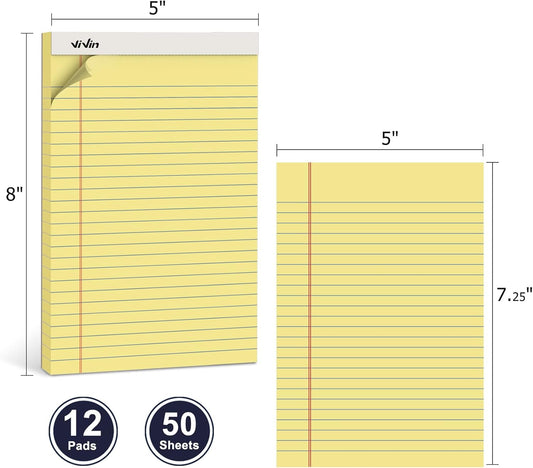 ViVin 5 x 8 Inch Legal Pads, 12 Pack, Narrow Ruled, 50 Sheets Per Writing Pad, Perforated Note Pads Ideal for Home, Office, Business, 600 Sheets, Canary Yellow Paper