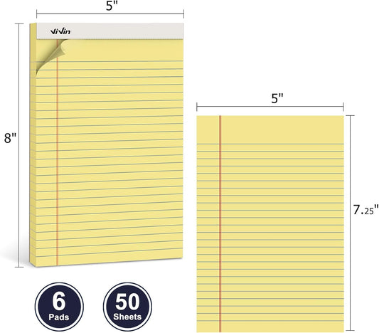 ViVin 5 x 8 Inch Legal Pads, 6 Pack, Narrow Ruled, 50 Sheets Per Writing Pad, Perforated Note Pads Ideal for Home, Office, Business, 300 Sheets, Canary Yellow Paper