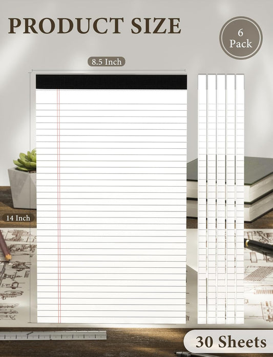 White Legal Pads 8.5 x 14, 6 Pack Wide Ruled Legal Notepads, White Note Pads 8.5 x 14 Writing Pads, Notebook Paper 8.5 x 14, Lined Tablets Notebook Pads of Paper, 70 GSM White Paper, 30 Sheets/Pad