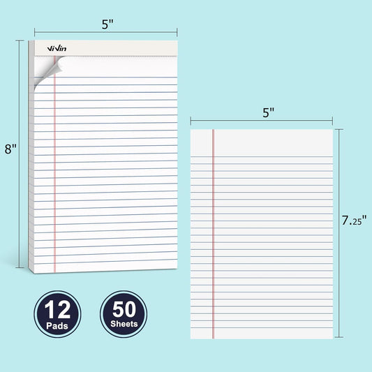 ViVin 5 x 8 Inch Legal Pads, 12 Pack, Narrow Ruled, 50 Sheets Per Writing Pad, Perforated Note Pads Ideal for Home, Office, Business, 600 Sheets, White Paper