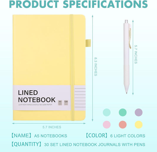 Aodaer 30 Set Lined Notebook Journals with Pens A5 Notebooks 100 GSM College Ruled Hardcover Notebook PU Leather Notepad with Pen Holder for Office School, 5.7 x 8.3 Inches, Light Multicolor