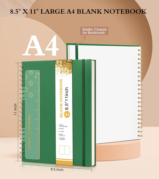 Blank Spiral Notebook Journal 8.5” x 11”, A4 Large Sketch Book for Women Men, 100 GSM Blank Paper Drawing Notebook, Plastic Hardcover Spiral Bound Sketchbook for Sketching Work School Writing, Green