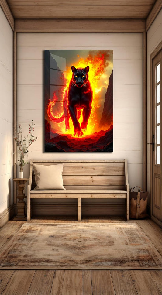 SpiritualHands Fiery Black Panther Glass Wall Art Painting for Living Room, Tempered Glass Modern Prints Decor, Large Vivid Color Panel for Bedroom, Kitchen, or Office