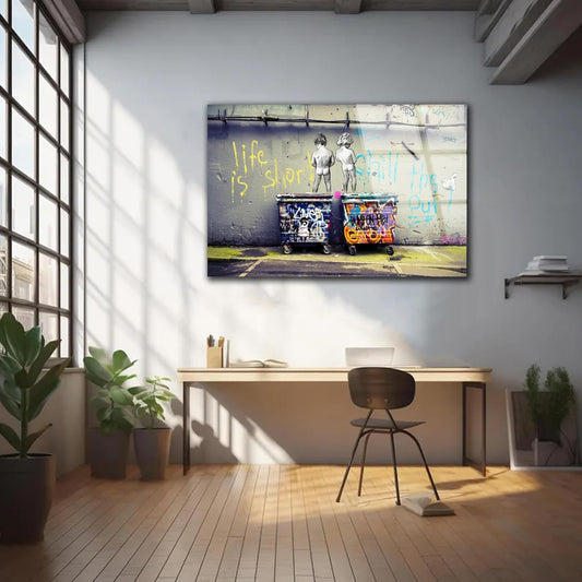 SpiritualHands Banksy Peeing Boys Life Is Short Printed Tempered Glass Wall Art Painting for Living Room, Tempered Glass Modern Prints Decor, Large Vivid Color Panel for Bedroom, Kitchen, or Office