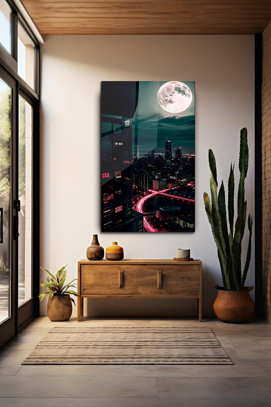 SpiritualHands Moon And City Glass Wall Art Painting for Living Room, Tempered Glass Modern Prints Decor, Large Vivid Color Panel for Bedroom, Kitchen, or Office
