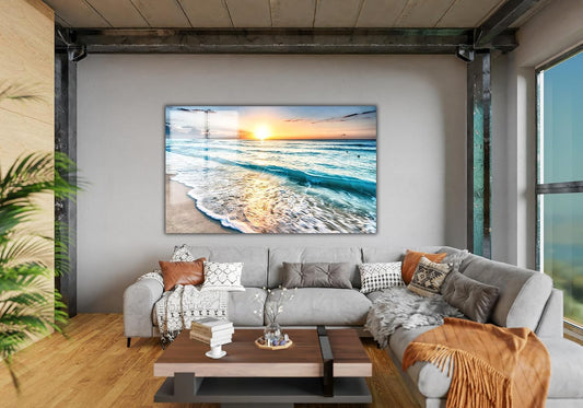 SpiritualHands Shining Sun and Waves Printed Tempered Glass Wall Art Painting for Living Room, Tempered Glass Modern Prints Decor, Large Vivid Color Panel for Bedroom, Kitchen, or Office