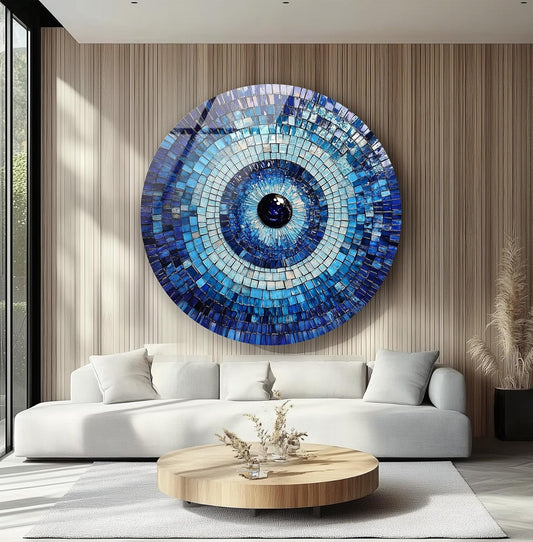 My Photostation.com 31.5''(80cm) Diameter Blue Mosaic Evil Eye Round Glass Wall Art Tempered Glass Printing Wall Decor Large Wall Art Wall Hangings
