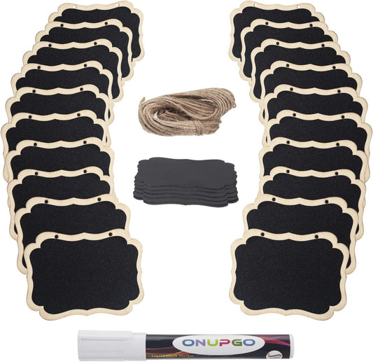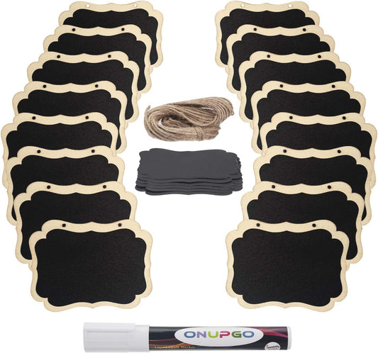 ONUPGO 20 Pack Mini Chalkboard Tags with Liquid Chalk Marker, Erasable Wooden Chalkboard Signs with Hanging String, Price Tags, Message Tags for Wedding Decor, Party Buffet Display, Place Cards