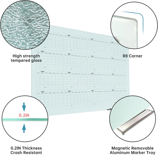 Magnetic Glass Yearly Calendar Whiteboard - Glass Dry Erase Board 48"x36" Large Frameless Glass Board for Walls Office School and Home