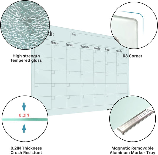 Magnetic Glass Whiteboard - Glass Monthly Calendar Dry Erase Board 48"x36" Large Frameless Glass Board for Walls Office School and Home