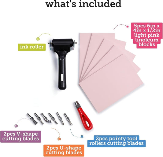 Linocut Kit for Printmaking with 5PCS 4"x6" Soft Rubber Linoleum Blocks, Brayer & Carving Tools – Block Printing & Stamp Making Supplies for Beginners & Artists