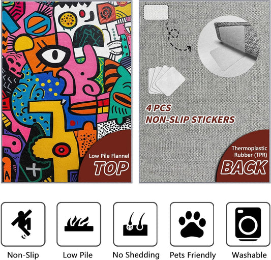 Abstract Rugs for Bedroom - Colorful Rug, 7x9 Area Rugs, Pop Art Graffiti Multicolor Washable Foldable Large Carpet Home Decor