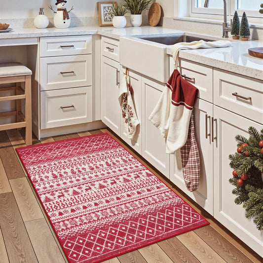 Christmas Runner Rug, 2x6 Red Christmas Kitchen Runner Rug, Non-Slip Washable Indoor Door Mat, Winter Xmas Holiday Floor Decor Carpet Runners for Hallways Bedroom Laundry Room