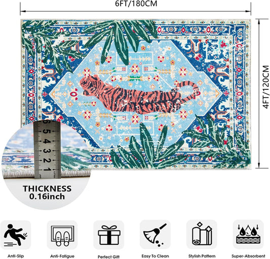 Washable Blue Rugs Thin Oriental Boho Vintage Tropical Jungle 6x9 Area Rugs for Bedroom Kitchen Dining Living Room Office Distressed Indoor Plant Entry Carpet