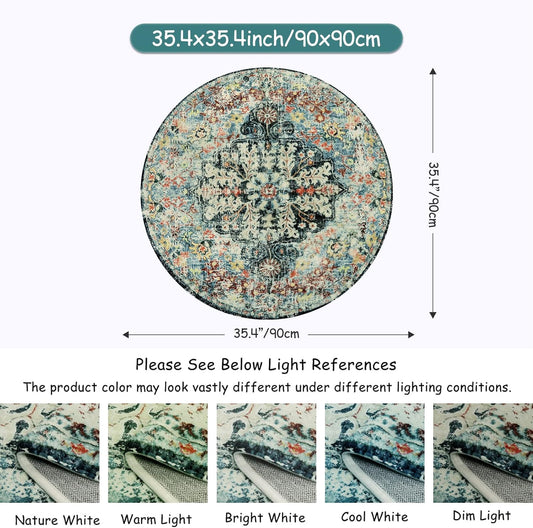 Lahome Bohemian Round Rug 3Ft Small Bedroom Round Area Rug Soft Bathroom Circle Mat, Vintage Machine Washable Non Slip Low Pile Indoor Floor Carpet for Kitchen Laundry Entryway, Blue Purple/Multi