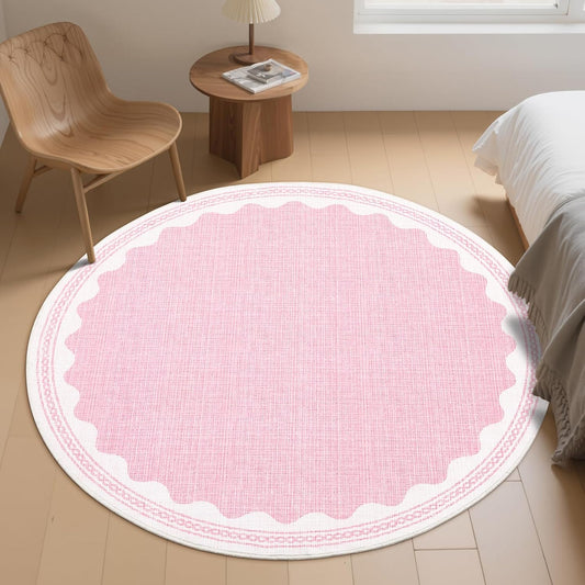 Scalloped Round Rug 6ft, Small Area Rugs Solid Pink Rug for Bedroom Girls, Washable Rugs for Living Room, Non Slip Scalloped Round Bath Mat, Soft Dorm Nursery Carpet for Bedside