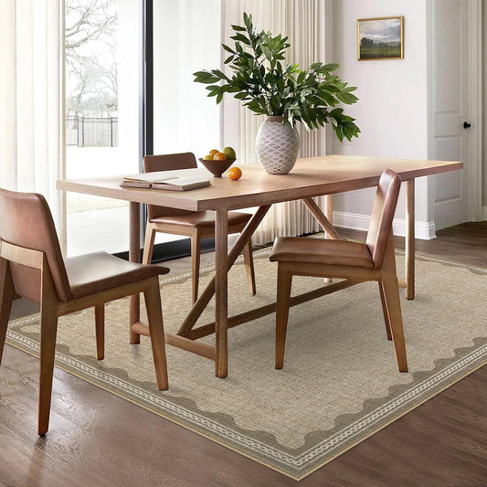 Scalloped Washable Rug 9x12 Area Rugs for Living Room, Solid Tan Rug for Bedroom Girls, Non Slip Throw Mat with Rubber Back, Soft Dorm Nursery 9x12 Carpet for Dining Room