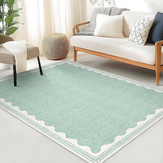 Scalloped Washable Rugs for Living Room, Solid Green 6x9 Area Rugs for Bedroom Girls, Non Slip Scalloped Rug with Rubber Back, Soft Dorm Nursery 6x9 Rugs for Dining Room