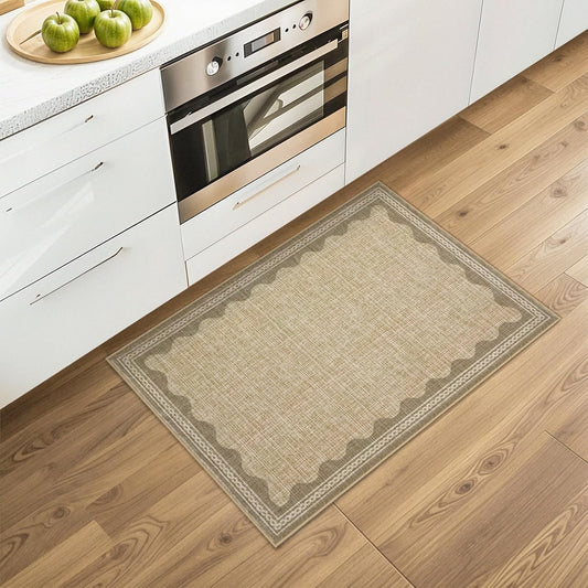 Scalloped Washable Area Rug, 6' x 9' Rectangular, Beige, Non Slip, Machine Washable, Indoor, Low Pile, Polyester, Solid, Tufted, Foldable, Stain Resistant, Shed Resistant