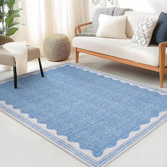 Scalloped Washable Rugs for Living Room, Solid Blue 6x9 Area Rugs for Bedroom Girls, Non Slip Scalloped Rug with Rubber Back, Soft Dorm Nursery 6x9 Rugs for Dining Room