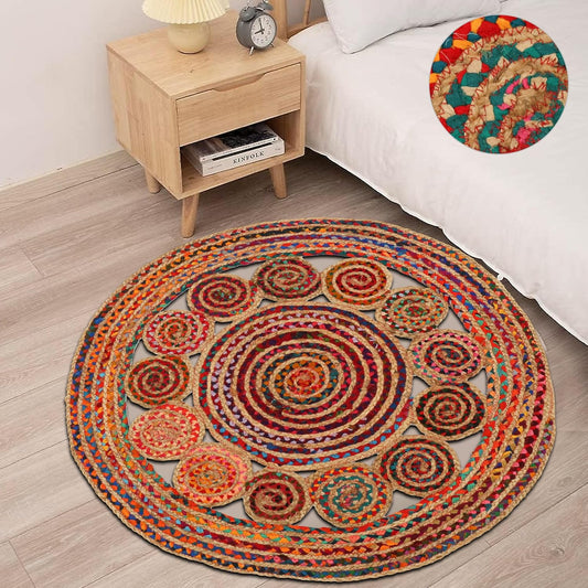 4' Round Handwoven Jute Chindi Area Rug - Colorful Boho Rugs for Living Room - Hand Braided Multicolor Bohemian Rug for Farmhouse, Bedroom, Dining Room, Classroom, Hallway, Kitchen, Office
