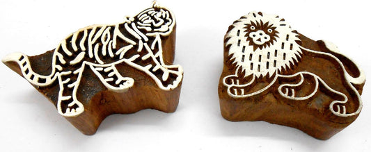 Lion Tiger Wooden Blocks Stamps for Printing on Textiles, Pottery Crafts,Henna, Scrapbooking (Set of 2)