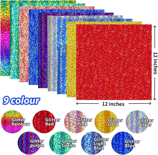 GIRAFVINYL Holographic Glitter Permanent Vinyl Bundle, 9 Assorted Colors 12-Inch Sheets, Glitter Vinyl Permanent Self-Adhesive Durable for Indoor/Outdoor Crafts, Easy to Cut/Weed with Protective Film