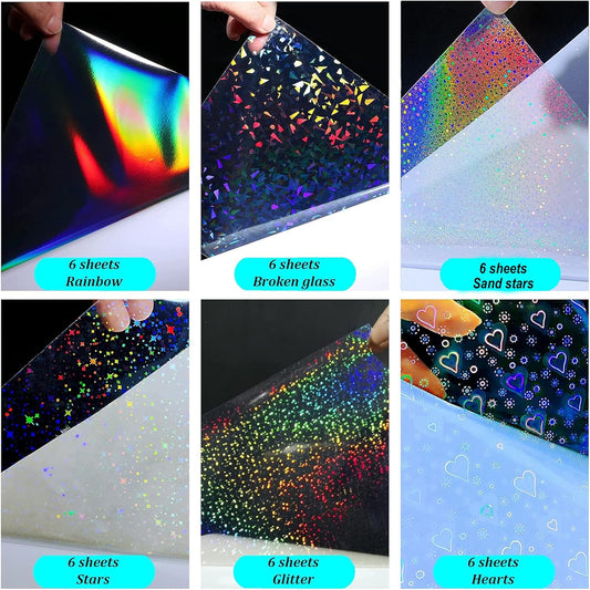36 Sheets Holographic Sticker Paper Clear Vinyl Sheets Self-Adhesive Overlay Film Laminate Sticker Paper Rainbow/Dots/Star/Broked Glass/Sand Star/Heart, 8.5x11 Inch