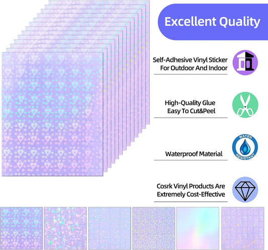 Holographic Sticker Paper, 36 Sheets Transparent Holographic Vinyl Overlay Lamination Sheets, Clear Self Adhesive Laminate Sticker Film for Stickers DIY Crafts, Heart Patterns - 8.5x11 Inch