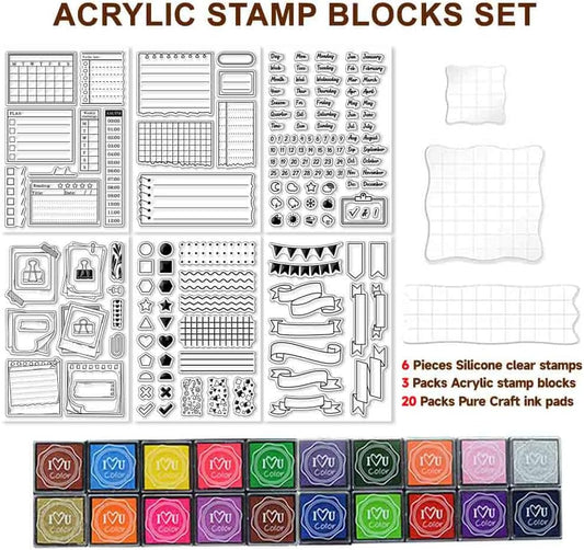 29 Pcs Journal Stamps for Crafting Card Making Supplies Set Include 3 Acrylic Clear Stamp Blocks, 6 Clear Silicone Stamps Seals, 20 Craft Ink Pads Calendar Planner Stamp for DIY