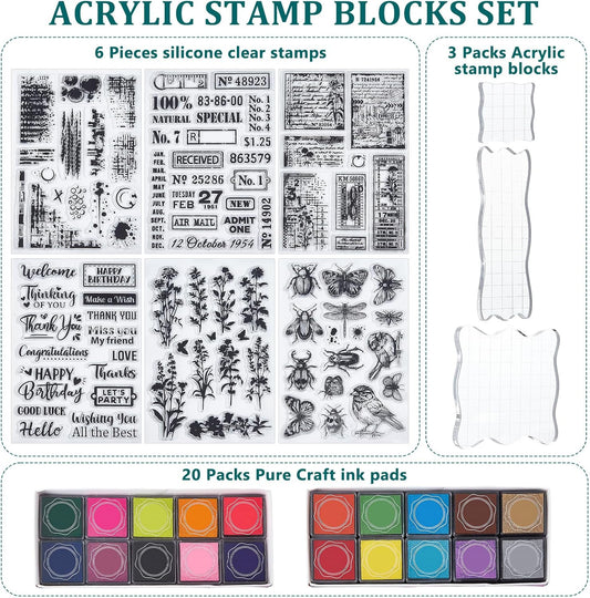 29 Pcs Acrylic Stamps for Crafting Card Making Supplies Set Include 3 Acrylic Clear Stamp Blocks, 6 Clear Silicone Stamps Seals, 20 Craft Ink Pads Stamp for DIY Scrapbooking Journal