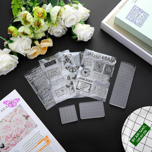 Yinder 7 Pcs Vintage Rubber Clear Stamps Set 4 Sheet Transparent Postage Silicone Stamps 3 Pcs Acrylic Stamp Block Tools with Grid Lines Rubber Craft Supplies for DIY Scrapbooking Journaling